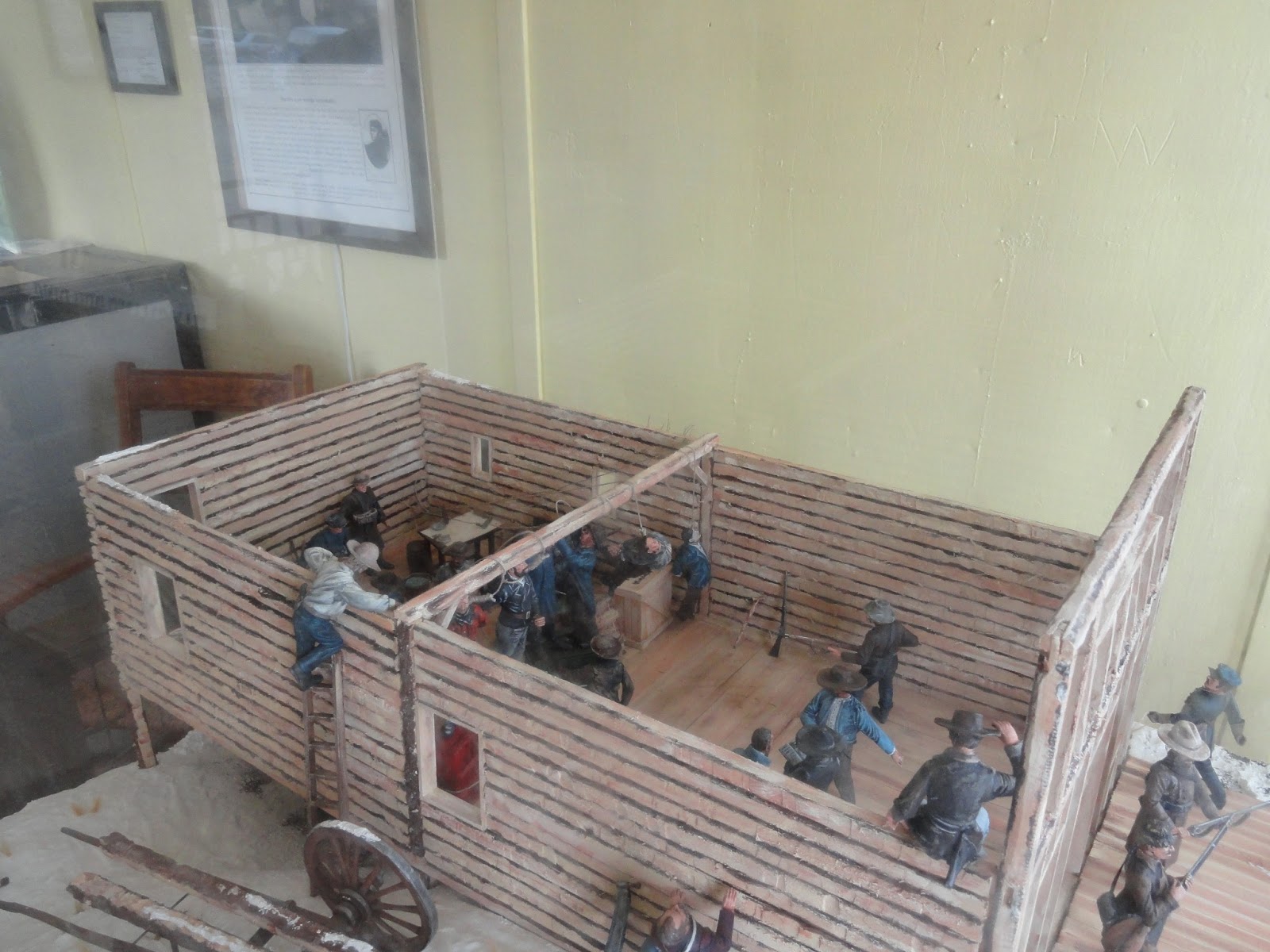 Notice the part of the roof where it sticks up a bit? (about halfway back) That is the support beam that the 5 criminals buried up on boot hill were hung. The were convicted to be hung, and this building was being built. So...they took them there and hung them on the beam.
